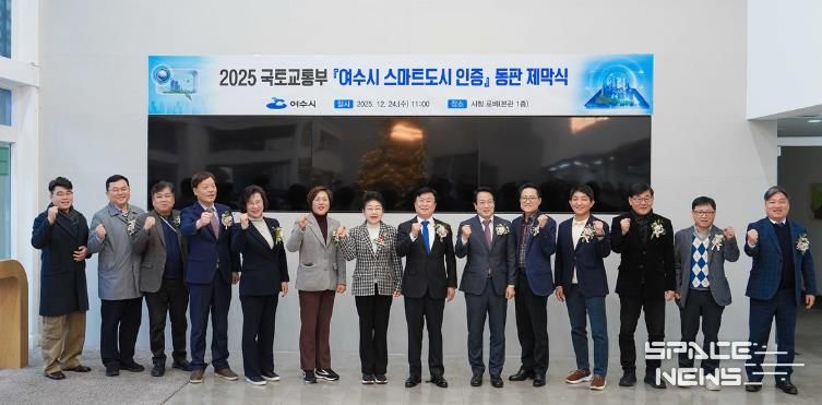 스페이스뉴스 스페이스뉴스 기자 | 여수시는 호남권 최초로 국토교통부 주관 ‘2025년 스마트도시 인증’에 선정되면서 지난 24일 시청 본관 1층 로비에서 동판 제막식을 개최했다.