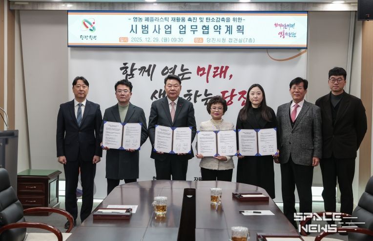 스페이스뉴스 스페이스뉴스 기자 | 당진시는 12월 29일 당진시청 7층 접견실에서 당진시, 당진시 이장단협의회, ㈜그린폴리텍, ㈜리코와 함께 ‘영농 폐플라스틱 재활용 촉진 및 탄소감축 시범사업’업무협약을 체결했다고 밝혔다.