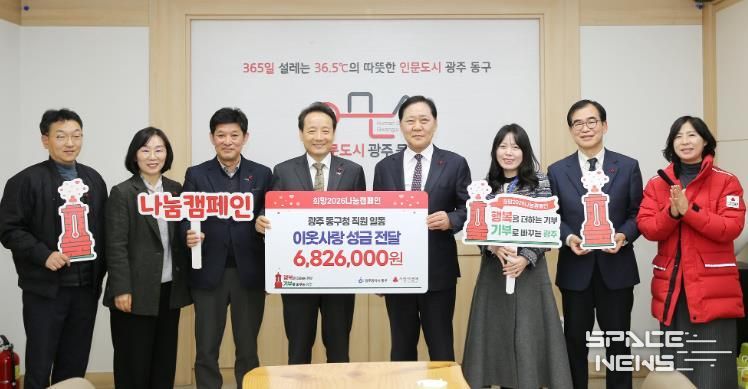 스페이스뉴스 스페이스뉴스 기자 | 광주 동구는 지난 6일 구청 접견실에서 ‘희망 2026 나눔캠페인 직원 성금 전달식’을 갖고, 직원들의 자발적인 참여로 모금한 성금을 광주사회복지공동모금회에 전달했다고 밝혔다.