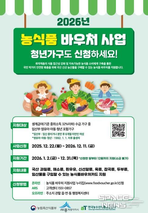 스페이스뉴스 스페이스뉴스 기자 | 세종특별자치시가 올해부터 취약계층 가구의 국내산 농산물 구입을 지원하는 ‘농식품 바우처 사업’을 확대 시행한다고 8일 밝혔다.