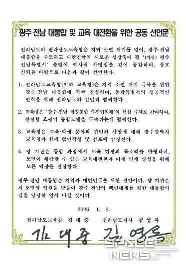 스페이스뉴스 스페이스뉴스 기자 | 전라남도교육청과 전라남도가 광주·전남 대통합과 교육 대전환을 위한 공동선언문을 발표했다.