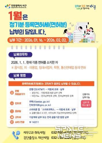 스페이스뉴스 스페이스뉴스 기자 | 인천 서구는 2026년도 1월 정기분 등록면허세 8만5천여 건, 28억9천4백만 원을 부과하고 올해 2월 2일까지 납부를 당부하는 등 적극적인 홍보에 나섰다.