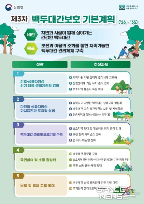 스페이스뉴스 스페이스뉴스 기자 | 산림청은 백두대간을 국가적 생태자산으로서 가치를 높이기 위한 ‘제3차 백두대간 보호 기본계획(2026~2035)’을 14일 발표했다.