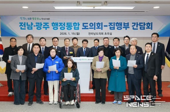 스페이스뉴스 스페이스뉴스 기자 | 전라남도의회는 19일 도의회에서 김영록 전라남도지사와 김대중 전라남도교육감이 참여한 가운데 ‘전남·광주 행정통합 도의회–집행부 간담회’를 열고, 통합 추진 방향과 주요 쟁점에 대해 심도 있는 논의를 진행했다.