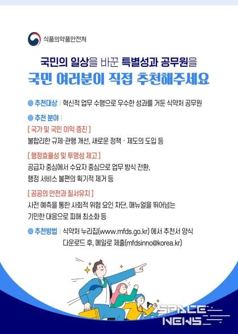 스페이스뉴스 스페이스뉴스 기자 | 식품의약품안전처는 국민이 체감하는 탁월한 성과를 창출한 공무원을 국민이 직접 추천해 포상하는 ‘국민추천제’를 1월 20일부터 운영한다고 밝혔다.