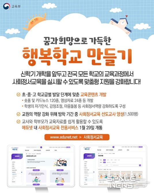 - 교사와 학부모가 교육자료를 쉽게 활용할 수 있도록 에듀넷 내 사회정서교육 전용서비스 1월 29일 개통