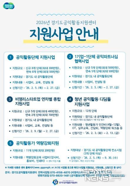 스페이스뉴스 스페이스뉴스 기자 | 경기도공익활동지원센터가 ‘2026년 경기도 공익활동 지원사업’에 참여할 도내 공익활동 단체를 모집한다.