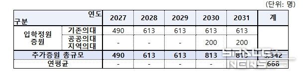 이와 함께 2027년의 경우 기존의대는 증원규모의 80% 규모(490명)를 증원하도록 해서 증원 초기 의대교육 현장의 부담을 완화할 수 있도록 했다.