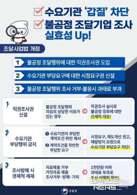 개정안의 핵심은 ‘공정조달 3종 세트’로, 불공정 조달행위에 대한 직권조사 체계를 마련하고, 수요기관의 부당한 요구를 금지하며, 조사·자료 제출 요구 불응 등에 과태료를 부과하는 것이다.