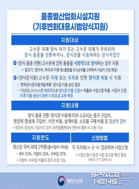 스페이스뉴스 스페이스뉴스 기자 | 해양수산부는 기후변화에 선제적으로 대응하고 어가의 소득 안정을 도모하기 위해 2월 23일부터 3월 31일까지 ‘2026년 기후변화 대응 시범 양식 지원사업’ 대상 어가를 공모한다고 밝혔다.