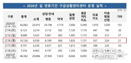 스페이스뉴스 스페이스뉴스 기자 | 소방청은 2026년 설 연휴 기간(2.14.~2.18., 5일간)전국 총 45,082건의 구급 출동으로 24,166명을 이송하였으며, 구급상황관리센터에서 총 42,062건의 상담을 실시했다고 밝혔다.