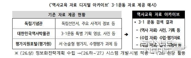 또한, 학생의 탐구 역량을 키우는 역사 수업 활성화를 위해 ‘탐구 중심 역사 교육과정 운영 사례집’(’26. 3종→’27. 9종)을 개발·보급한다. 더불어, 각종 기관·누리집(플랫폼) 등에 분산된 근현대 사료와 교육자료, 체험 자료 등을 수업에 즉시 활용할 수 있도록 교사에게 묶음(패키지) 형태로 제공하는 ‘역사교육 자료 아카이브’를 구축(ʹ27)할 예정이다.