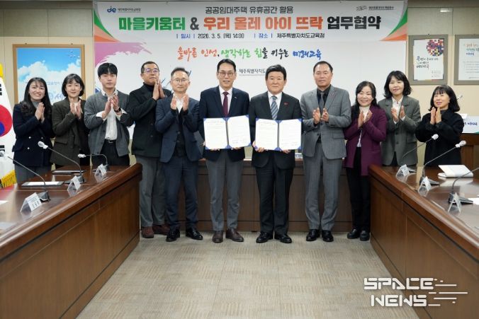 스페이스뉴스 스페이스뉴스 기자 | 제주특별자치도교육청은 제주특별자치도개발공사와 5일 도교육청 상황실에서 공공임대주택 유휴공간을 활용한 ‘우리 올레 아이 뜨락’ 사업과 도교육청 ‘2026 마을키움터 운영’ 사업의 상호 협력을 위한 업무협약을 체결했다.
