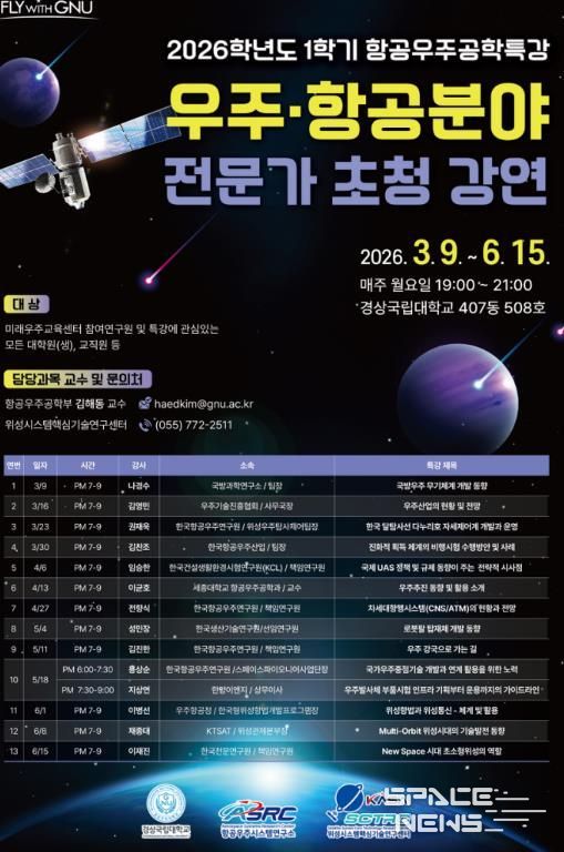 스페이스뉴스 스페이스뉴스 기자 | 경상국립대학교 위성시스템핵심기술연구센터는 3월 9일부터 6월 15일까지 13차례에 걸쳐 우주‧항공 분야 전문가 초청강연을 진행한다.