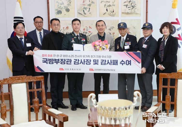 스페이스뉴스 스페이스뉴스 기자 | 강원특별자치도는 국방부 유해발굴감식단이 추진한 ‘2025년 민·관·군 협업 6·25전사자 유가족 집중 찾기’ 사업에서 전국 최초 민관군 협업 6.25전사자 유가족 찾기 지원 우수기관으로 선정돼, 3월 9일 국방부장관으로부터 감사장과 감사패를 수상했다고 밝혔다.