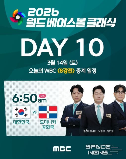 스페이스뉴스 스페이스뉴스 기자 | 2026 월드 베이스볼 클래식(WBC)에서 한 편의 드라마 같은 서사를 써 내려가고 있는 대한민국 야구 대표팀이 이제 약속의 땅, 미국 마이애미에서 운명의 8강전을 치른다. MBC는 내일(14일) 토요일 오전 6시 50분부터 미국 마이애미 현지에서 대한민국과 도미니카 공화국의 8강전 경기를 생중계한다.