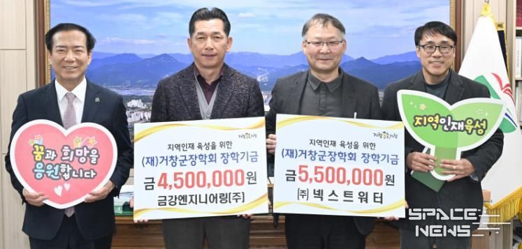거창하수처리장 관리대행 업체인 ㈜넥스트워터(대표 김인석)와 금강엔지니어링㈜(대표 정선용)은 각각 550만 원과 450만 원을 거창군장학회에 기탁하며, 운영 수입의 일부를 지역사회에 환원하고 지역인재 양성에 보탬이 되는 뜻깊은 나눔을 실천했다.