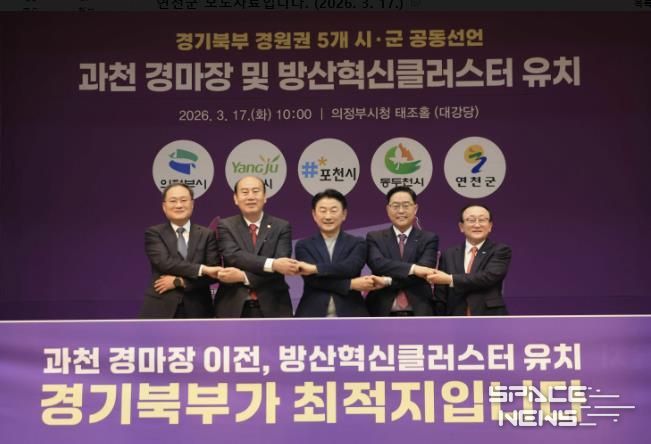 스페이스뉴스 스페이스뉴스 기자 | 연천군은 17일 의정부시청 태조홀에서 열린 ‘경기북부(경원권) 5개 시ㆍ군 공동선언식’에 참석해 과천경마공원(렛츠런파크 서울) 및 경기도 방산혁신클러스터의 경기북부 유치를 강력히 촉구했다고 밝혔다.