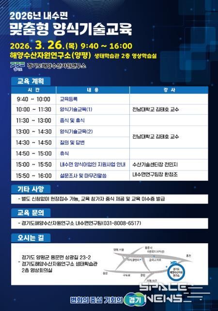 스페이스뉴스 스페이스뉴스 기자 | 경기도해양자원연구소는 오는 26일 양평에 있는 연구소 생태학습관에서 내수면 양식 어업인의 역량 강화를 위한 양식기술교육을 실시한다.