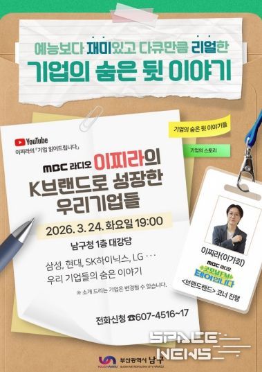 스페이스뉴스 스페이스뉴스 기자 | 부산 남구는 3월 24일 화요일 오후 7시, 남구청 1층 대강당에서‘남구열린대학 특강’을 개최한다고 밝혔다. 강연은 MBC라디오 ⌜굿모닝FM테이입니다⌟ 브랜드랜드 코너에서 기업 이야기를 재치 있고 알기 쉽게 전달하는 이찌라(본명 이가희)가 진행한다.