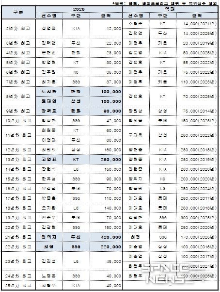 또한 2026시즌부터 시행되는 아시아쿼터 선수들의 연봉도 집계됐다. LG 웰스, SSG 타케다, 두산 타무라가 각각 20만 달러씩 받으며 아시아쿼터 선수 연봉(계약금 포함) 공동 1위에 올랐다.