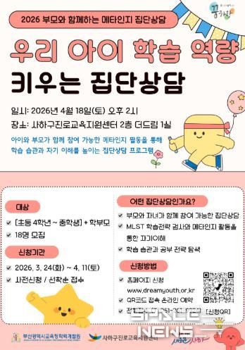 스페이스뉴스 스페이스뉴스 기자 | 사하구진로교육지원센터는 오는 4월 18일 토요일 오후 2시, MLST 학습전략 검사와 부모·자녀 간 학습 역지사지 역할극 활동을 통해 타인과 자기 이해에 도움을 주는 '메타인지 집단상담' 프로그램을 운영한다.