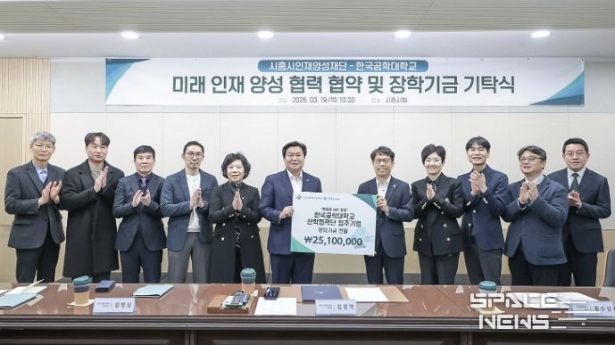 스페이스뉴스 스페이스뉴스 기자 | 시흥시인재양성재단은 지난 3월 19일 시청 다슬방에서 한국공학대학교와 지역인재 장학사업 추진을 위한 업무협약을 체결하고, 산학협력단 내 입주기업들이 조성한 장학기금 총 2,510만 원의 기탁식을 진행했다.