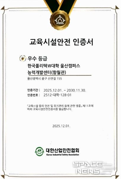 스페이스뉴스 스페이스뉴스 기자 | 한국폴리텍대학(이사장 이철수)은 2023년부터 3년간 전국 캠퍼스를 대상으로 추진해 온 '교육시설안전 인증' 사업을 성공적으로 마무리하며, 총 103개 교육시설동과 다솜고등학교에 대한 안전 인증을 완료했다고 23일 밝혔다.