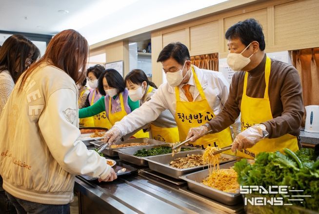 스페이스뉴스 스페이스뉴스 기자 | 서울 동대문구 경희대 정문 옆 연화사 공양간에 점심시간을 앞두고 대학생들이 하나둘 모여들었다. 수업을 마친 학생들이 줄을 서자 사찰 안은 금세 북적였다. 스님들과 자원봉사자들이 분주히 음식을 나르고, 공양간 앞에서는 학생들끼리 “오늘 메뉴가 뭐냐”며 웃음 섞인 대화를 주고받았다. 그 줄 앞에 이필형 동대문구청장도 섰다. 학생들에게 직접 음식을 건네며 “밥 잘 챙겨 먹고, 학업과 미래 준비도 힘내라”고 말을 건넸다. 이 구청장은 연화사 ‘청년밥心’ 현장에서 배식자로 참여해 대학생들을 격려했다.