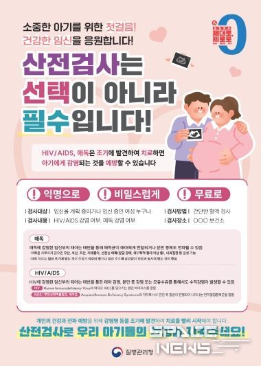 이미 임신 중인 여성을 위한 ‘임신 초기 산전 검사’는 B형간염(항원, 항체), 매독, 에이즈, 전혈구 검사 포함 4종을 연중 실시한다. 예비맘 검사는 신분증을, 임신 초기 검사는 신분증과 임신확인증을 지참해 보건소 모자보건실로 방문하면 된다.