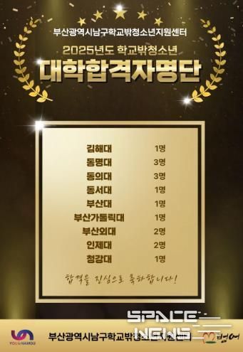 스페이스뉴스 스페이스뉴스 기자 | 부산 남구 학교밖청소년지원센터는 센터 소속 학교 밖 청소년 15명이 부산대학교, 인제대학교, 동의대학교, 청강대학교 등의 다양한 대학에 합격하는 성과를 거뒀다고 밝혔다.