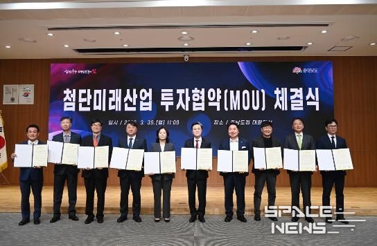 김태흠 지사는 30일 도청 대회의실에서 오세현 아산시장 등 3개 시군 시장·군수, 김동회 디앤알파트너스 대표이사 등 6개 기업 대표와 투자협약(MOU)를 체결했다.