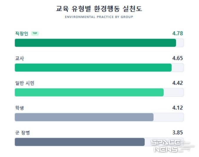 교육 대상별로는 직장인이 4.78점으로 가장 높은 실천도를 보였고, 교사 4.65점, 일반 시민 4.42점 순이었다. 학생은 4.12점, 군 장병은 3.85점에 그쳤다.