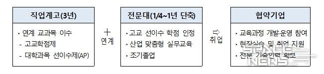 전문대학은 직업계고·기업과 함께 고교 및 대학의 전공과목을 분석해 교육과정의 연계성을 높인다. 예를 들어 전문대학에서 대학과목과 유사하다고 판단한 기존 고교과목에 대해서는 학점 이수를 인정하고, 학점으로 인정하기 위해 보완이 필요한 고교과목은 새롭게 구성하는 방식이다. 또한, 전문대학에서 직업계고 학생 맞춤형으로 대학과목 선이수(AP) 과목을 개설해 운영할 수도 있다.