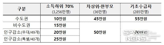 소득 하위 70% 국민에게 거주 지역별로 수도권 10만원, 비수도권 15만원, 인구감소 우대지역 20만원, 인구감소 특별지역 25만원을 지급할 예정이며, 한부모가족・차상위계층은 45만원, 기초생활수급자는 55만원을 지급하되 비수도권에 거주하는 경우에는 1인당 5만원을 추가 지급한다.