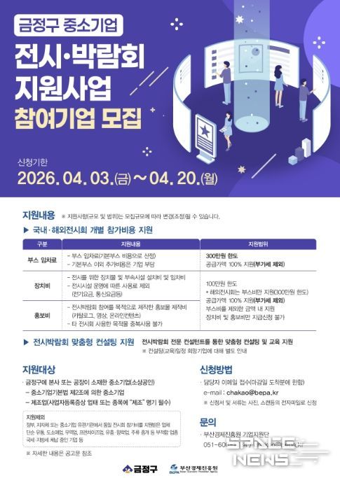 스페이스뉴스 스페이스뉴스 기자 | 부산 금정구는 관내 중소기업의 판로 개척과 시장 경쟁력 강화를 위하여 ‘금정구 중소기업 전시박람회 참가 지원 사업’ 참여 기업을 오는 4월 20일까지 모집한다고 밝혔다.