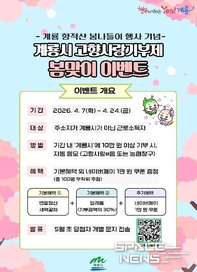 스페이스뉴스 스페이스뉴스 기자 | 충남 계룡시가 오는 10일부터 12일까지 엄사면 향한리·도곡리 일원에서 열리는 ‘제4회 향적산 봄나들이’ 행사를 기념해 고향사랑기부제 봄맞이 이벤트를 4월 7일부터 4월 24일까지 진행한다.