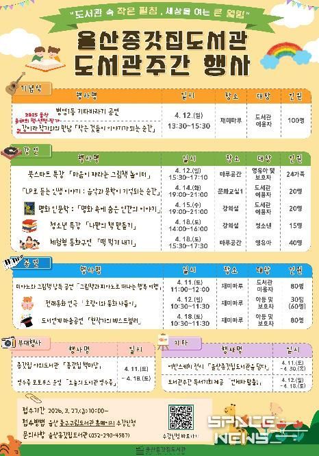스페이스뉴스 스페이스뉴스 기자 | 울산 중구가 제62회 도서관의 날·도서관 주간(4. 12.~4. 18.)을 맞아 4월 11일부터 4월 18일까지 지역 내 도서관 10곳에서 ‘2026년 도서관의 날·도서관 주간 행사’를 개최한다.