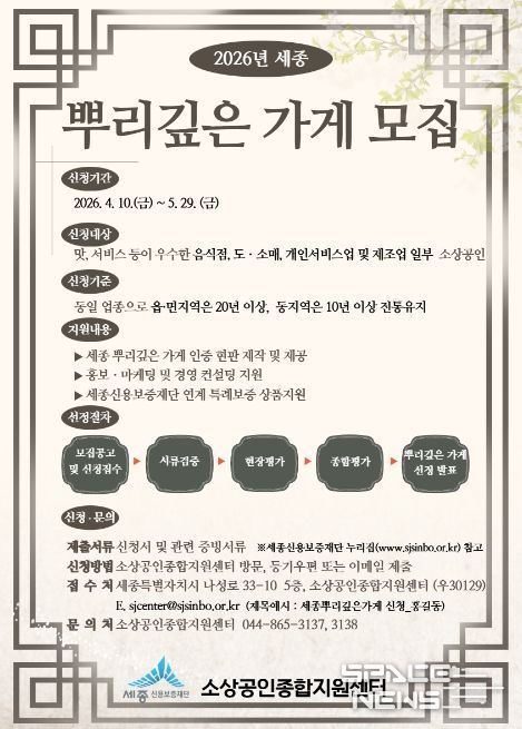 스페이스뉴스 스페이스뉴스 기자 | 세종특별자치시가 세종시만의 전통과 특색을 갖춘 장수 소상공인 업소를 발굴·육성하기 위해 2026년 ‘세종 뿌리 깊은 가게’대상자를 모집한다고 17일 밝혔다.