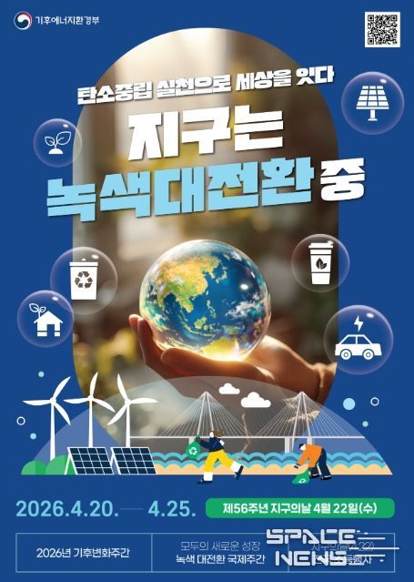 스페이스뉴스 스페이스뉴스 기자 | 기후에너지환경부는 지구의 날(4월 22일)을 맞아 4월 20일부터 24일까지 ‘2026년 기후변화주간’을 개최한다. 올해 기후변화주간은 ‘녹색대전환 국제주간(4.20~4.25)’과 연계되어 국제사회의 탄소중립 기술과 정책, 국민의 일상 속 기후행동 실천이 함께 어우러지는 탄소중립 실천문화 확산을 위한 참여와 공감의 장이 마련될 전망이다.