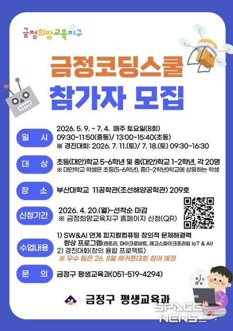 스페이스뉴스 스페이스뉴스 기자 | 부산 금정구는 초‧중학생을 대상으로 인공지능(AI) 및 소프트웨어(SW) 교육 프로그램인 녪금정 코딩스쿨’을 운영한다고 밝혔다.