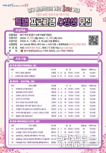 중구 관계자는 “중구 평생학습관 개관 1주년을 맞아 구민을 위한 다채로운 특강을 마련했다”라며 “앞으로도 다양한 평생교육 기회 제공과 교육 접근성 제고 등을 통해 구민 삶의 질 향상에 주력할 것”이라고 밝혔다.