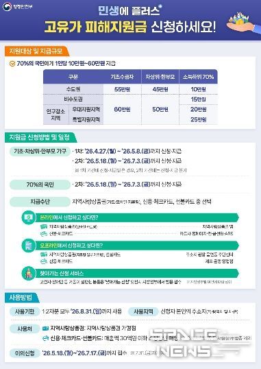 1차 지급은 4월 27일부터 5월 8일까지 진행되며 대상은 ▲기초생활수급자 ▲차상위계층 ▲한부모가족 등 취약계층이다. 지급 금액은 ▲기초생활수급자 60만 원 ▲차상위계층 및 한부모가족 50만 원이다.