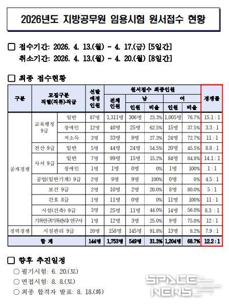 스페이스뉴스 스페이스뉴스 기자 | 부산광역시교육청은 지난 13일부터 17일까지 실시한 ‘2026년도 지방공무원 임용시험’ 원서접수 결과 144명 선발에 1,753명이 지원해 평균 12.2대 1의 경쟁률을 보였다고 밝혔다.