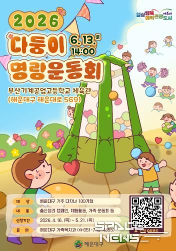 스페이스뉴스 스페이스뉴스 기자 | 해운대구는 다자녀가정 우대 및 가족친화적 분위기 조성을 위해 '2026년 다둥이 명랑 운동회'에 참여할 다자녀가족 100가정을 모집한다.
