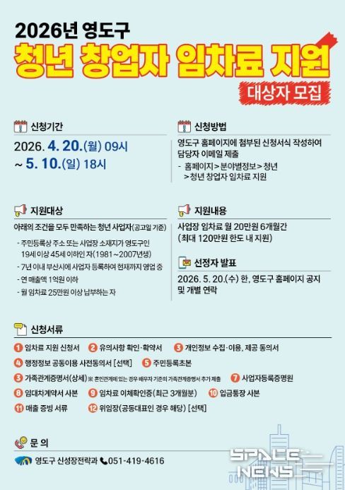 스페이스뉴스 스페이스뉴스 기자 | 부산 영도구는 청년 창업가들의 경제적 부담을 덜어주고 지역 내 안정적인 사업 기반 마련을 돕기 위해 지난해에 이어 '2026년 청년 창업자 임차료 지원사업' 참여자를 모집한다고 밝혔다.