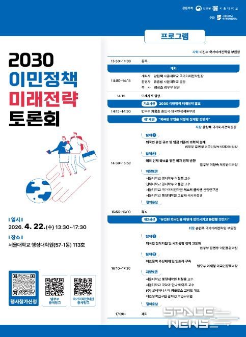 스페이스뉴스 스페이스뉴스 기자 | 법무부는 2026년 4월 22일 오후 2시 서울대학교 행정대학원에서 서울대학교(총장 유홍림)와 공동으로'2030 이민정책 미래전략'토론회를 개최했다.
