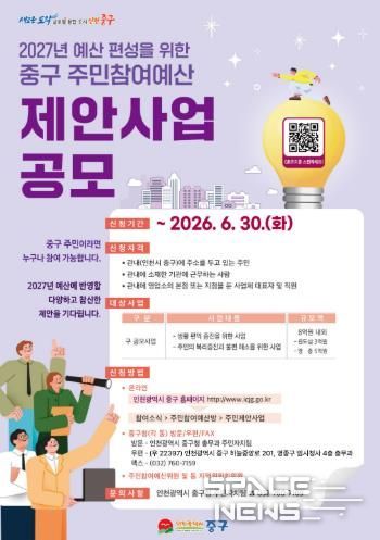 스페이스뉴스 스페이스뉴스 기자 | 인천시 중구는 ‘2027년도 예산편성을 위한 주민참여예산 제안사업 공모’를 추진한다고 23일 밝혔다.