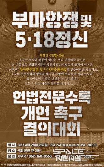 스페이스뉴스 스페이스뉴스 기자 | 광주광역시는 오는 28일 오후 2시 국회 본관 앞에서 개헌안 가결을 위한 정치권의 결단을 촉구하는 ‘부마항쟁 및 5·18정신 헌법 전문 수록 개헌 촉구 국민결의대회’가 열린다고 밝혔다.