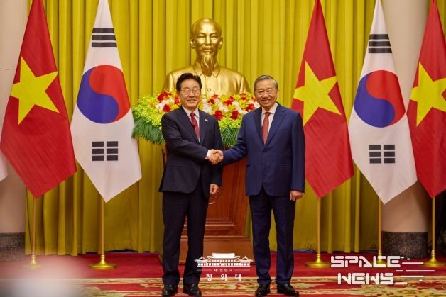 스페이스뉴스 스페이스뉴스 기자 | 베트남을 국빈 방문한 이재명 대통령은 22일(현지시간) "양국은 2030년까지 교역 규모 1500억 불 목표 달성을 위해 교역·투자 협력을 더욱 호혜적으로 발전시켜 나가기로 했다"고 밝혔다.